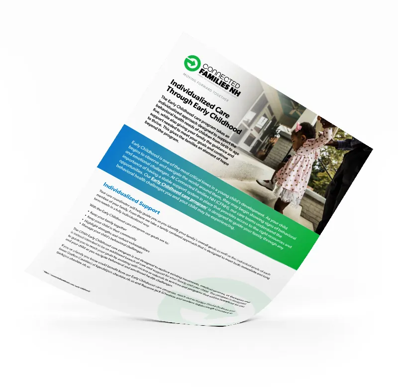 The next step is to reach out to Connected Families. First, download the referral form, fill it out with the information requested, and email it to earlychildhoodbh@dhhs.nh.gov. As you are waiting for next steps from the Bureau for Children's Behavioral Health, do not hesitate to follow up with them to learn the status of your referral or review our resources page for more helpful information.